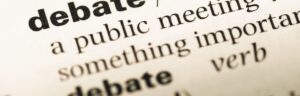 Close up of old English dictionary page with word debate